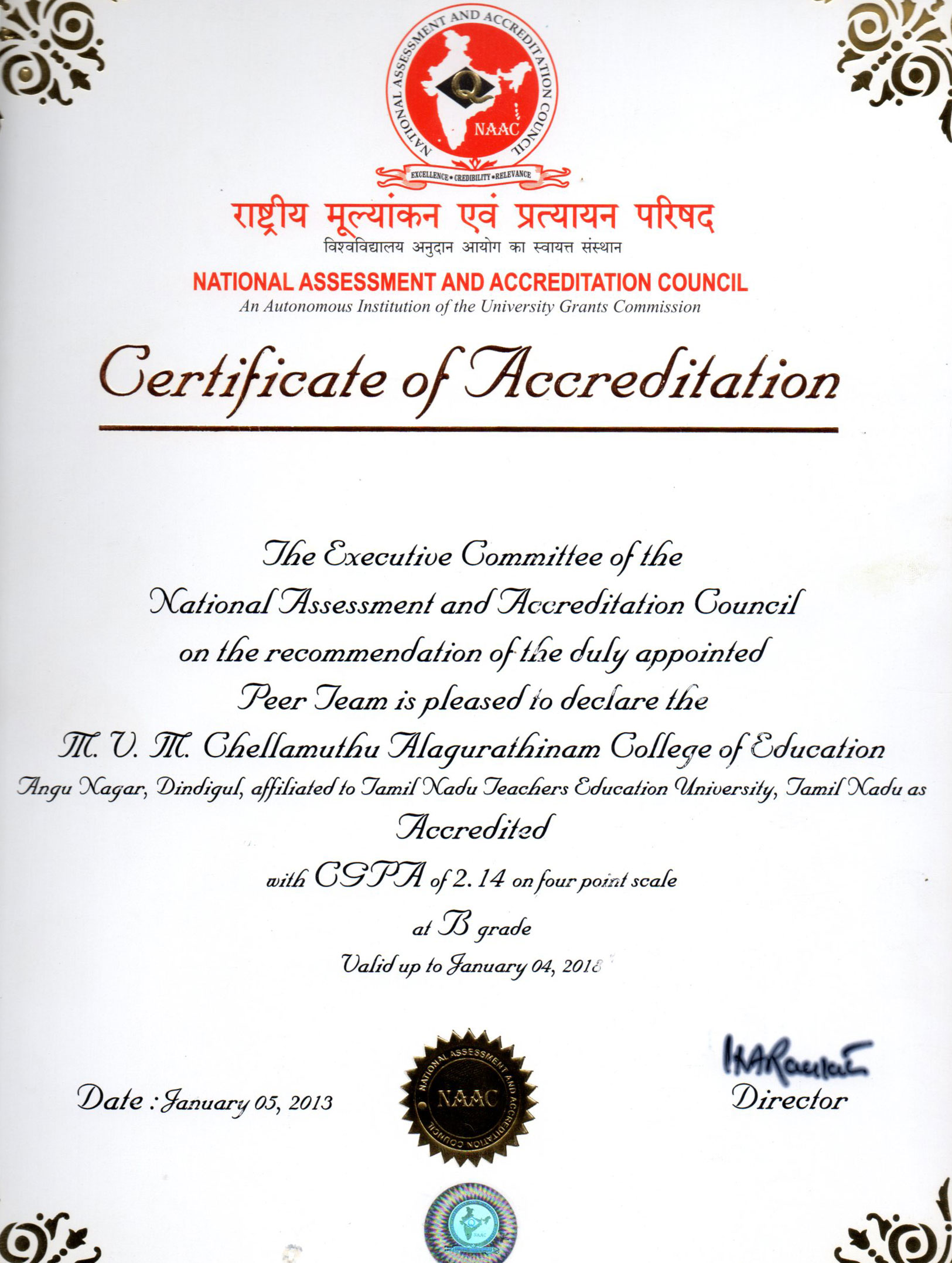Grade on 5th January 2013 by NAAC on the recommendations of peer team